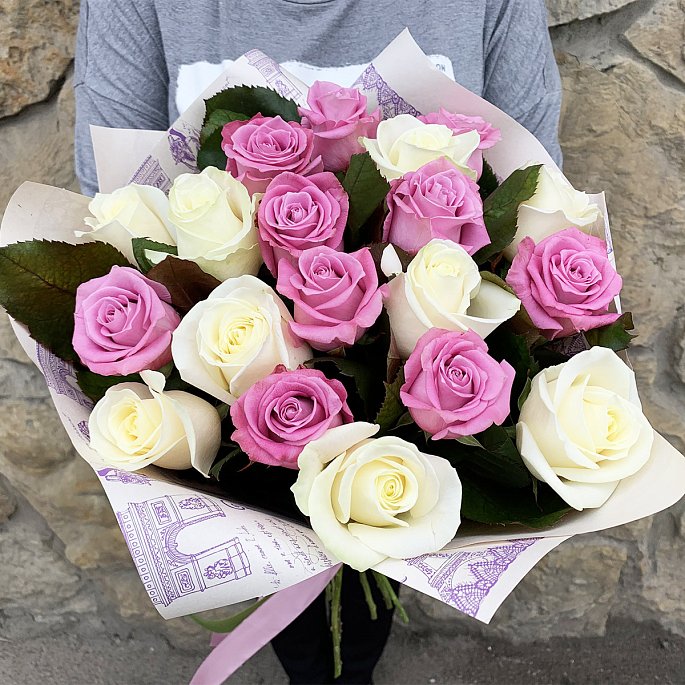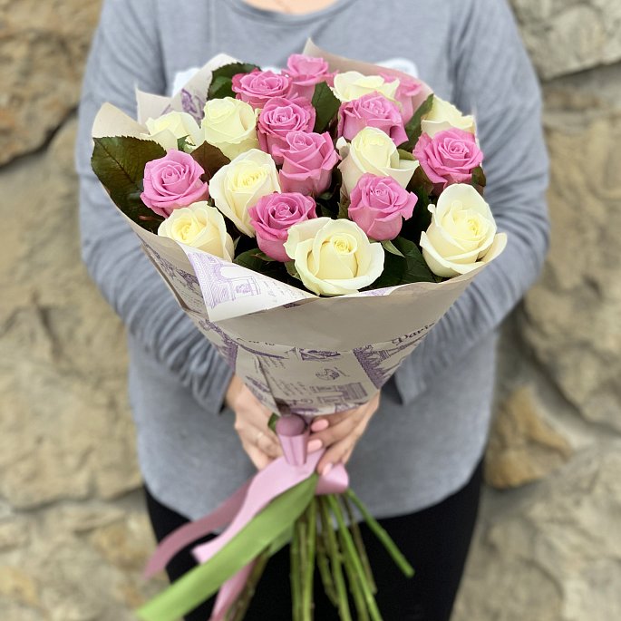 Букет из 19 роз "Аваланж и Маритим" в упаковке крафт-бумага.Размер букета: 27*27 см