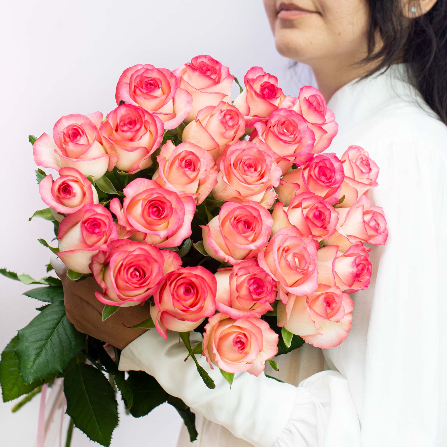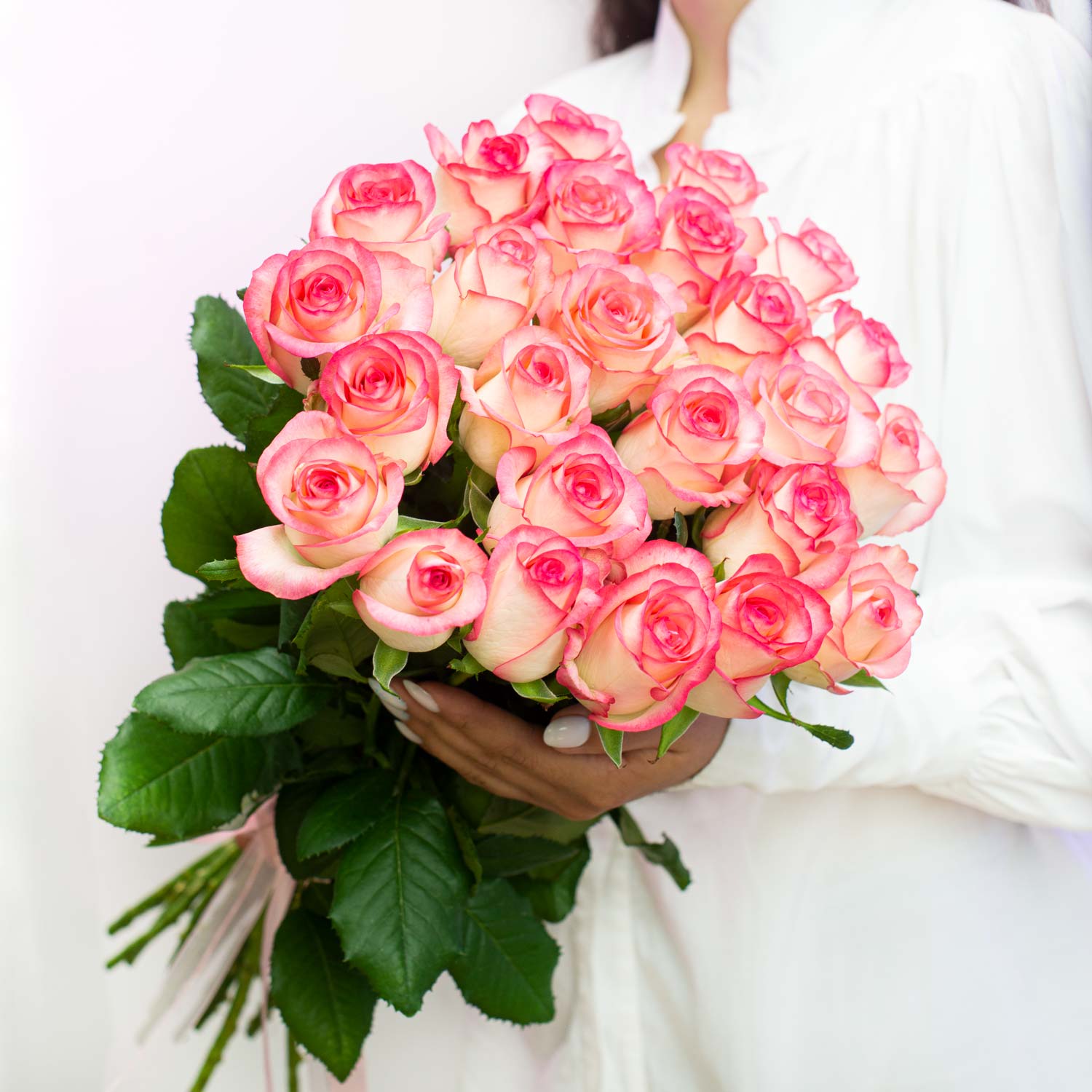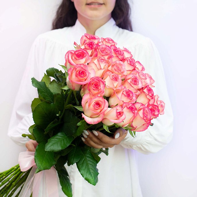 Двухцветная роза Россия переход от белого цвета к розовому на краях лепестков, сорт "Джумилия"Примерная высота: 55-60 см.