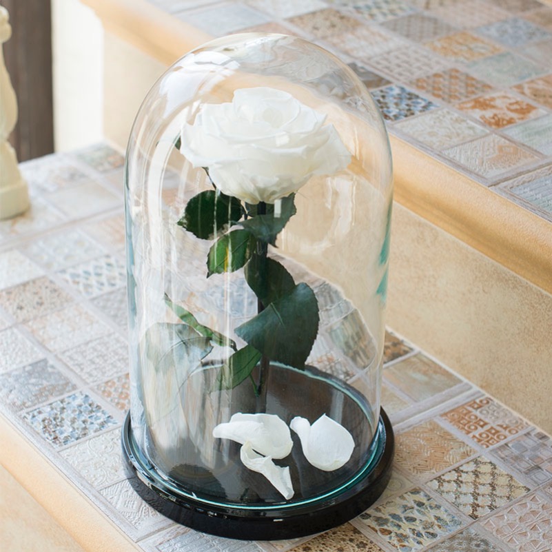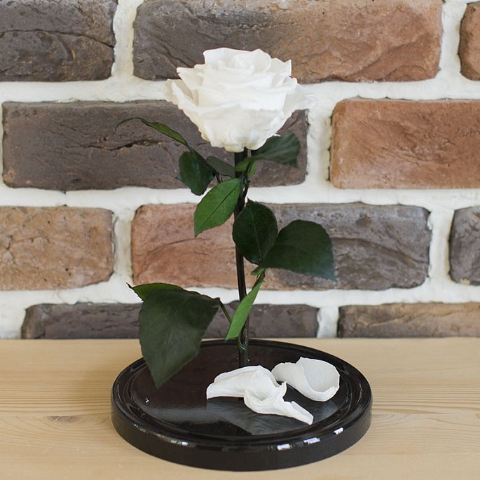 Настоящая живая роза в стабилизированном состоянии, сохраняет свой первоначальный вид в течение 4-7 лет.Роза доставляется на черной деревянной подставке и со стеклянной крышкой-колбой.