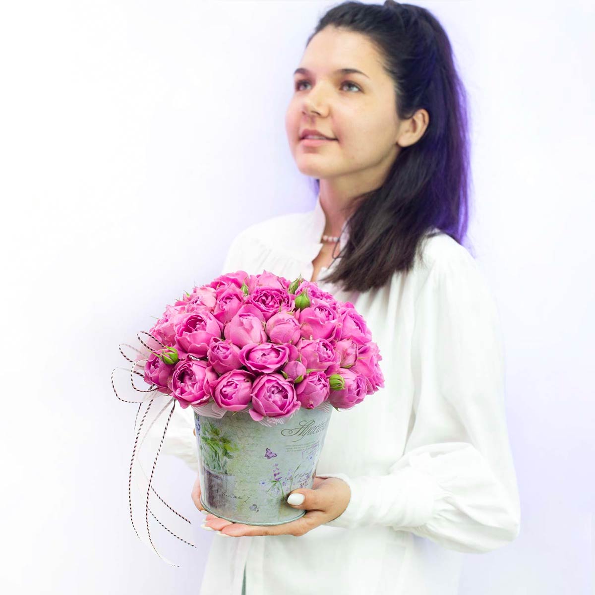 Небольшое ведерко во французском стиле с шикарной пионовидной кустовой розой "Мисти Баблс" - 10 веток, на ветке несколько цветов.Примерный диаметр композиции с цветами: 20-22 см