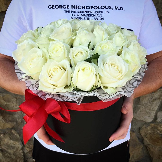 Потрясающий черный цилиндр из 25 белых роз сорта "Аваланж" и красной атласной лентой.Размер цилиндра 16*20 см.
