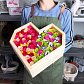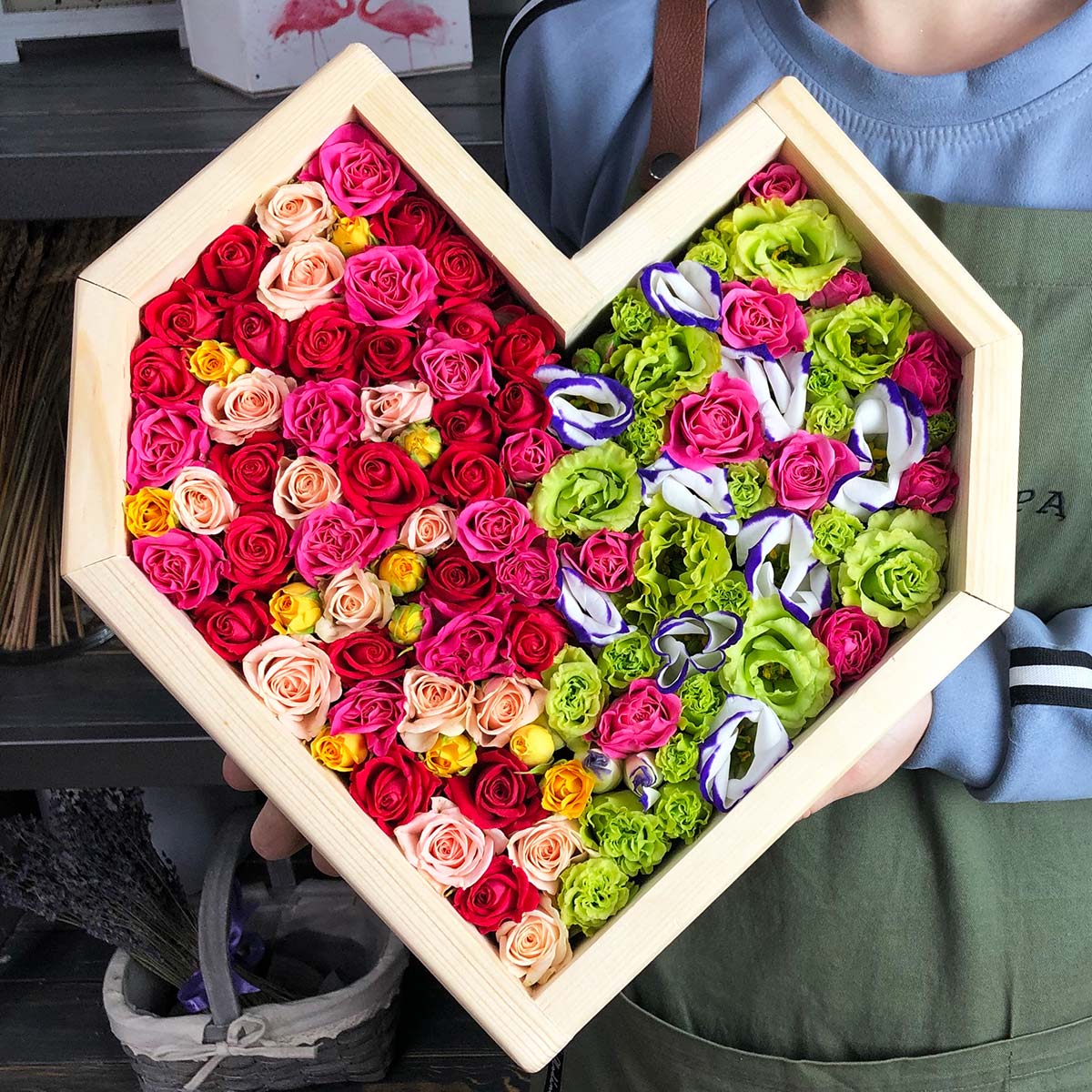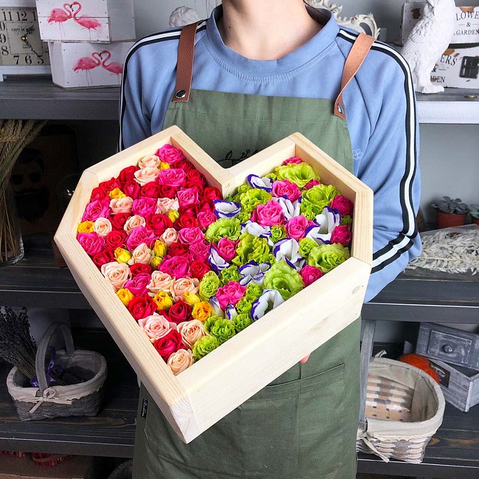 Яркое и необычное сердце из кустовых роз и эустомы в деревянном ящике.Состав сердца: