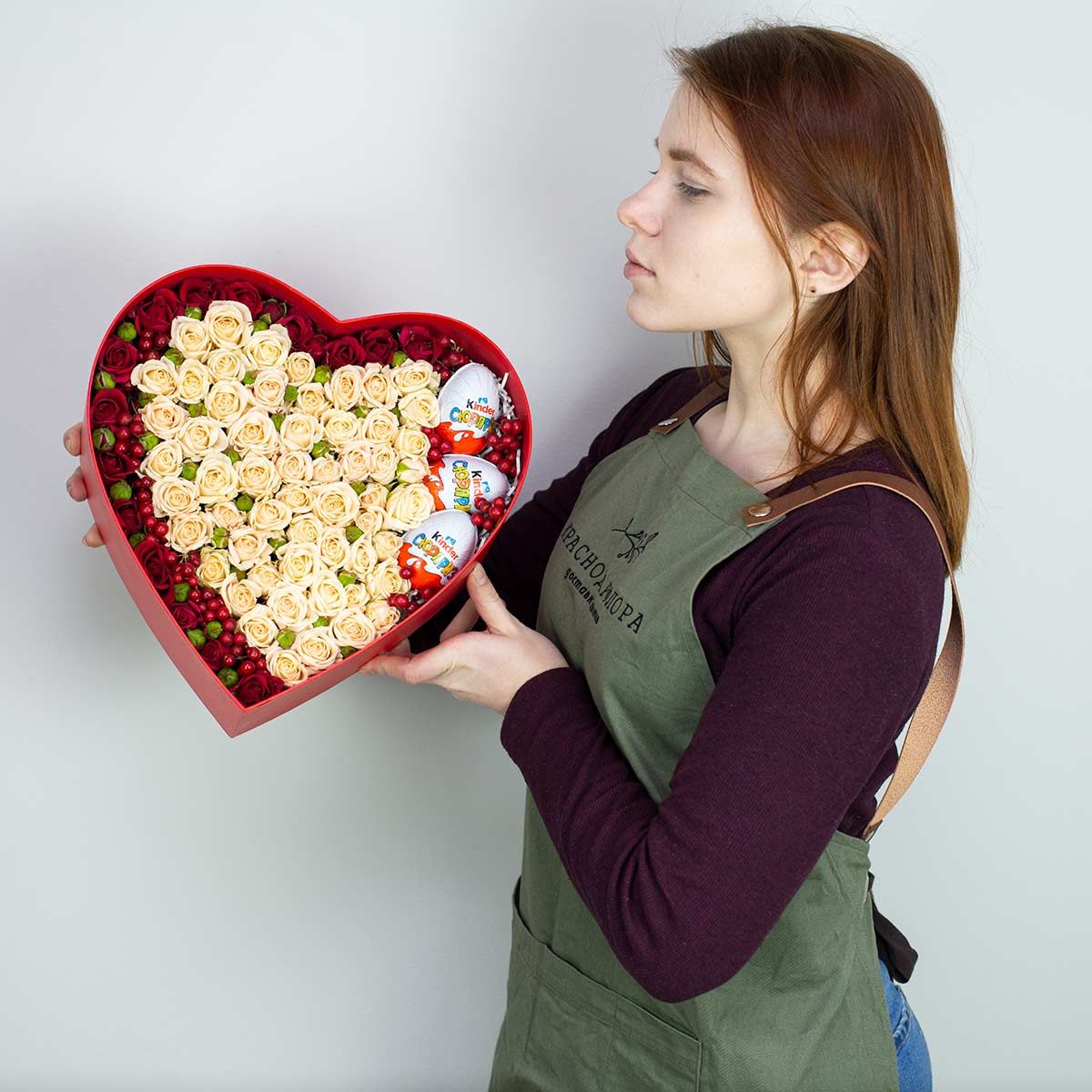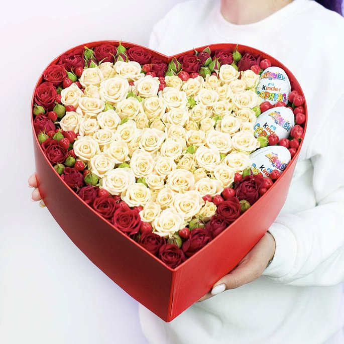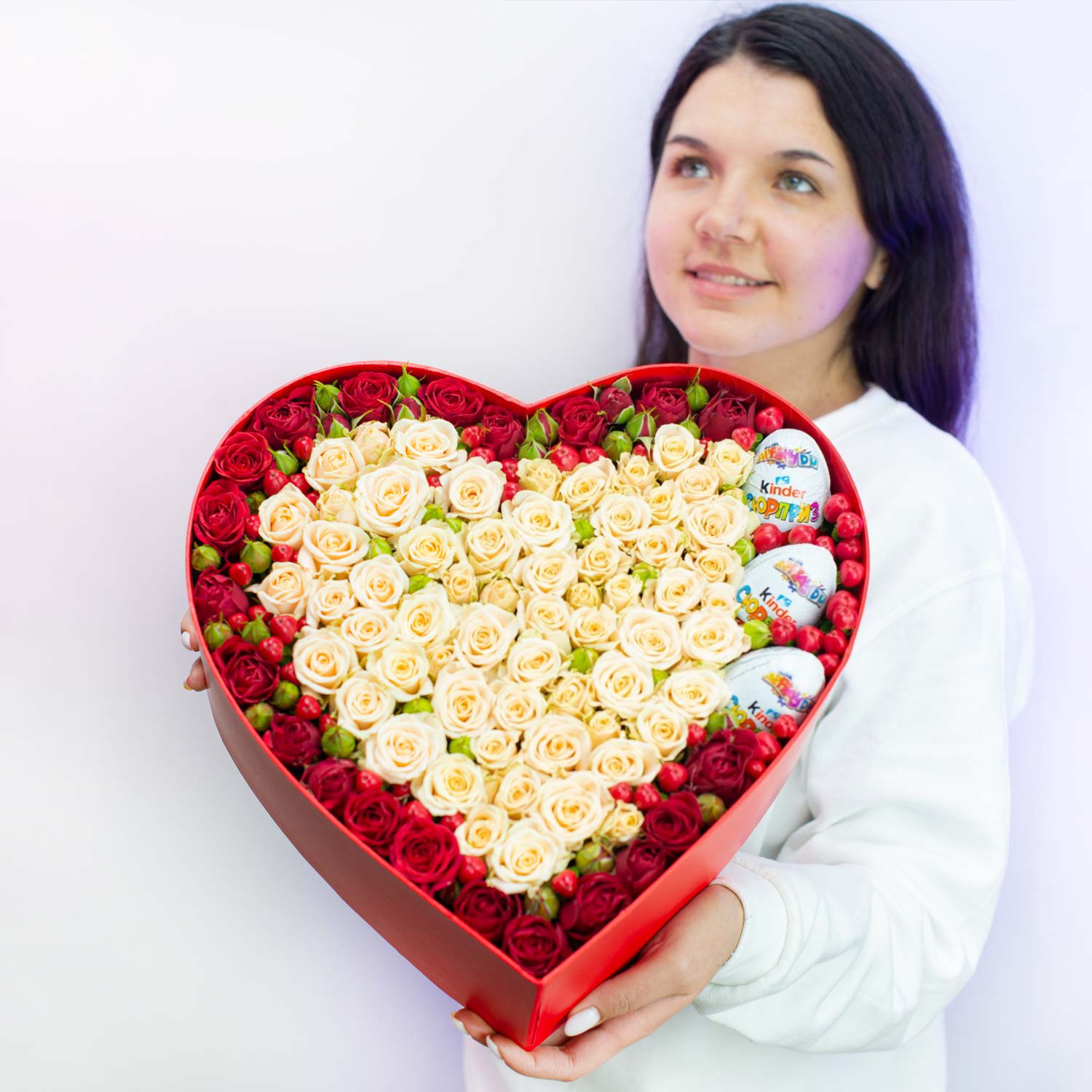 Коробка с крышкой в виде сердца с уложенными кустовыми розами, ягодами и Киндерами.Состав: