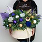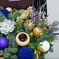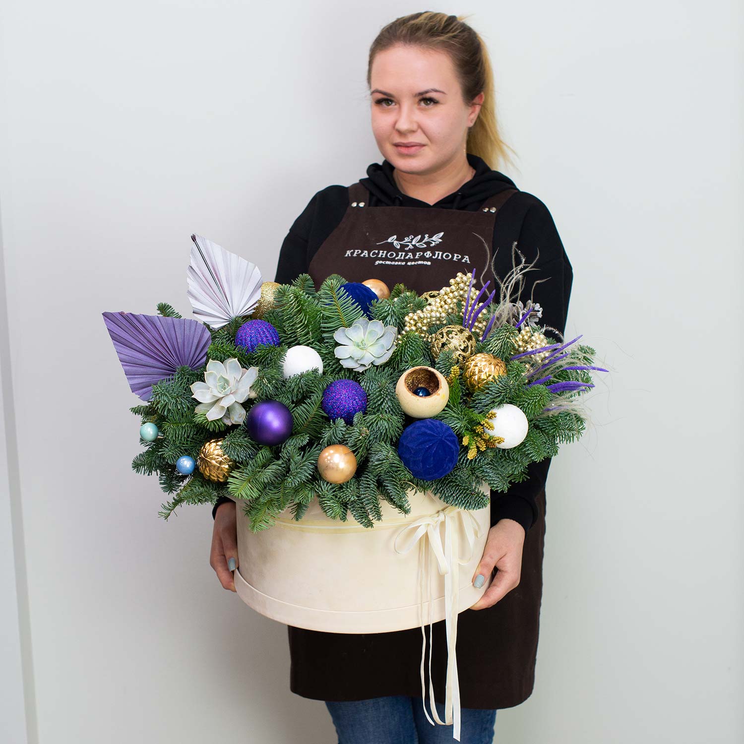 Большой бархатный цилиндр с еловыми ветками Нобилис, суккулентами, елочными игрушками и декором в сине-сиреневых тонах.Примерный диаметр цилиндра - 50-60 см