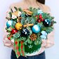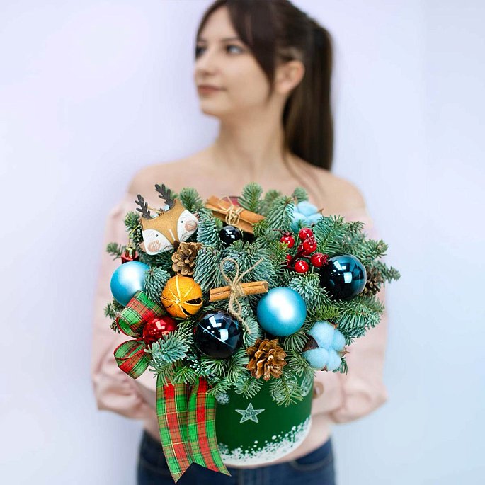 Новогодний цилиндр с зимним узором, ароматными еловыми веткам, разноцветными елочными шарами, шишками, декором.Состав композиции:
