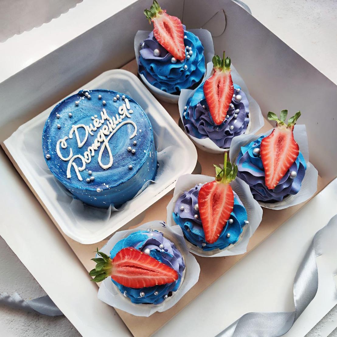 Бенто-торт и 5 капкейков с разнообразными начинками.Бенто-торт - это компактный размер торта, который помещается в коробочку для бенто или в ланч-бокс. Он больше, чем пирожное или порция торта, но гораздо меньше стандартного торта. Бенто-торт идеально подходит для индивидуального угощения или в качестве переносного десерта. Упакован в специальную упаковку с использованием лент, чтобы придать ему элегантность и легкость транспортировки.