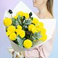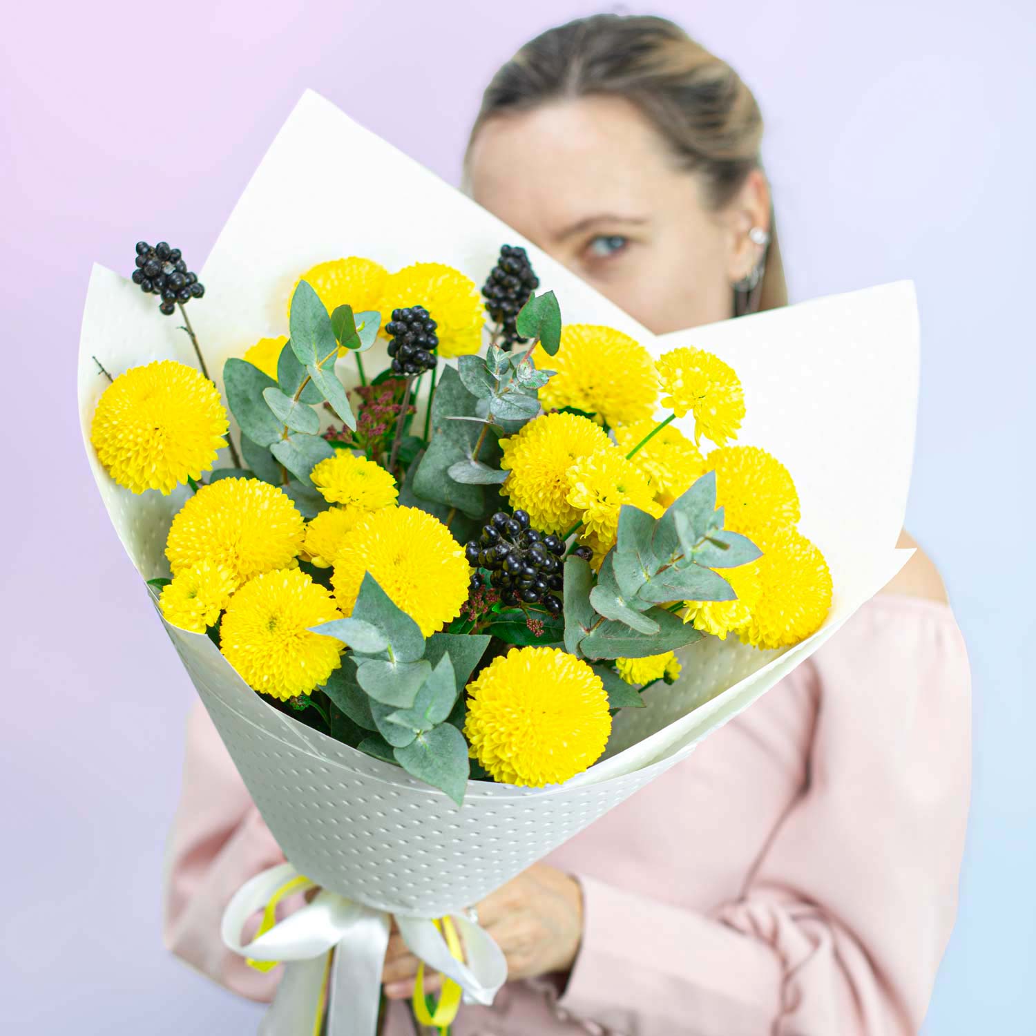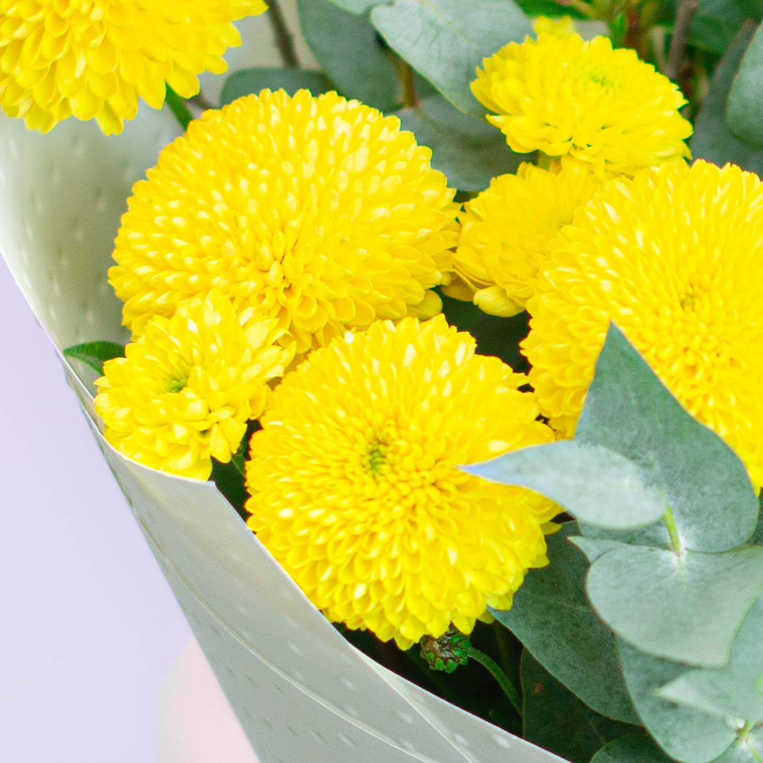 Букеты из осенних хризантем с ароматным эвкалиптом, который предает аромат, объем и фактуру букету.Примерный диаметр букета: 20 см