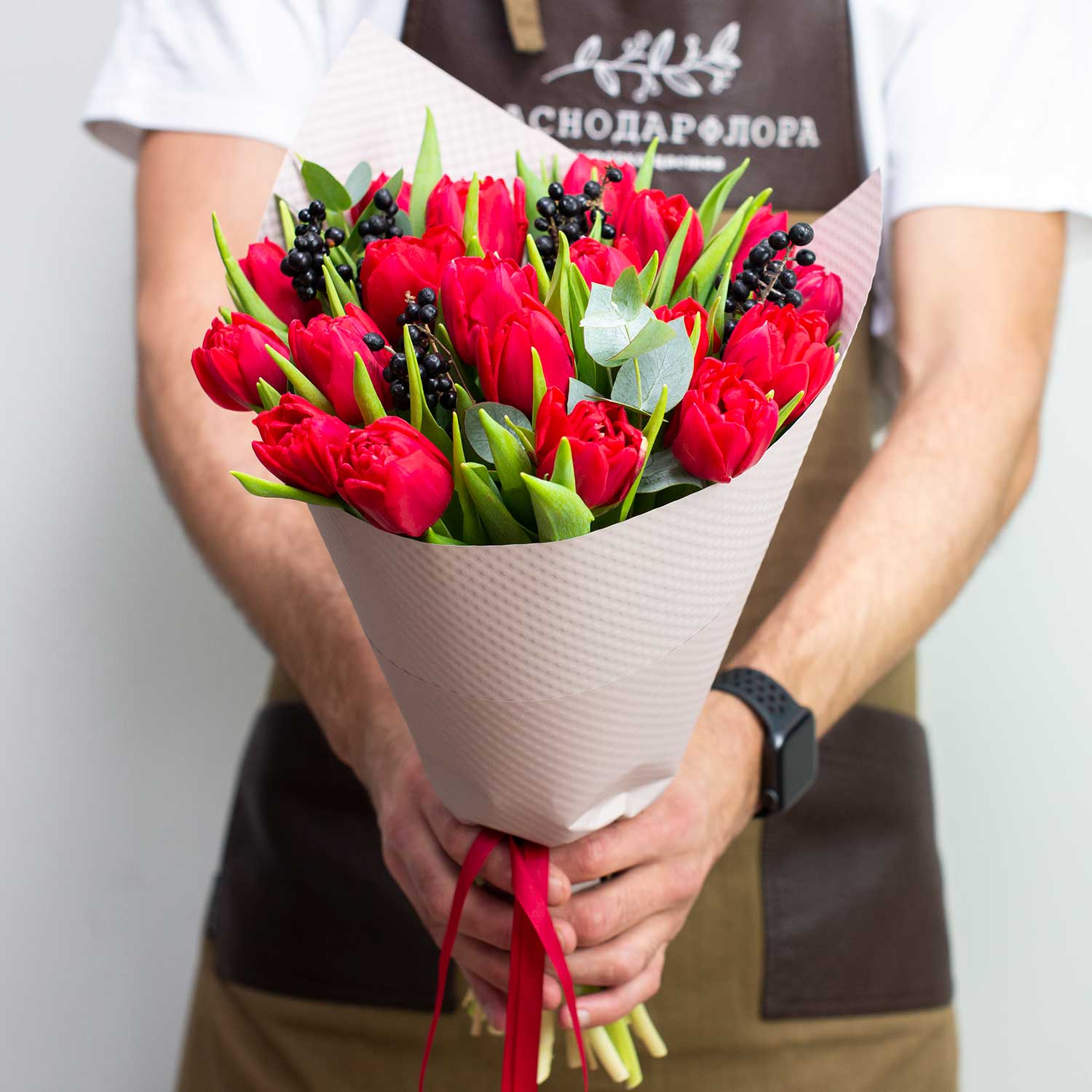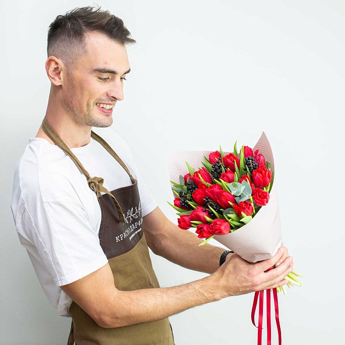 Букет из крутейших красных пионовидных тюльпанов с ароматным эвкалиптом и черными контрастными ягодами. Упаковка - фактурная бумага.Да, многие знают, что сезон тюльпанов это весна. Но наши флористы находят таких красавчиков даже осенью!