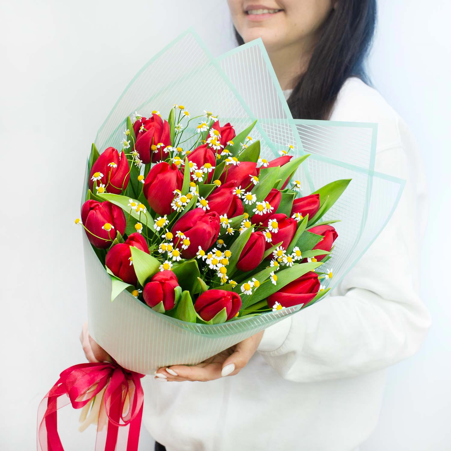 Букет из 19 ярко-красных тюльпанов с танацетумом (мелкоцветная ромашка).!Ограниченное предложение!