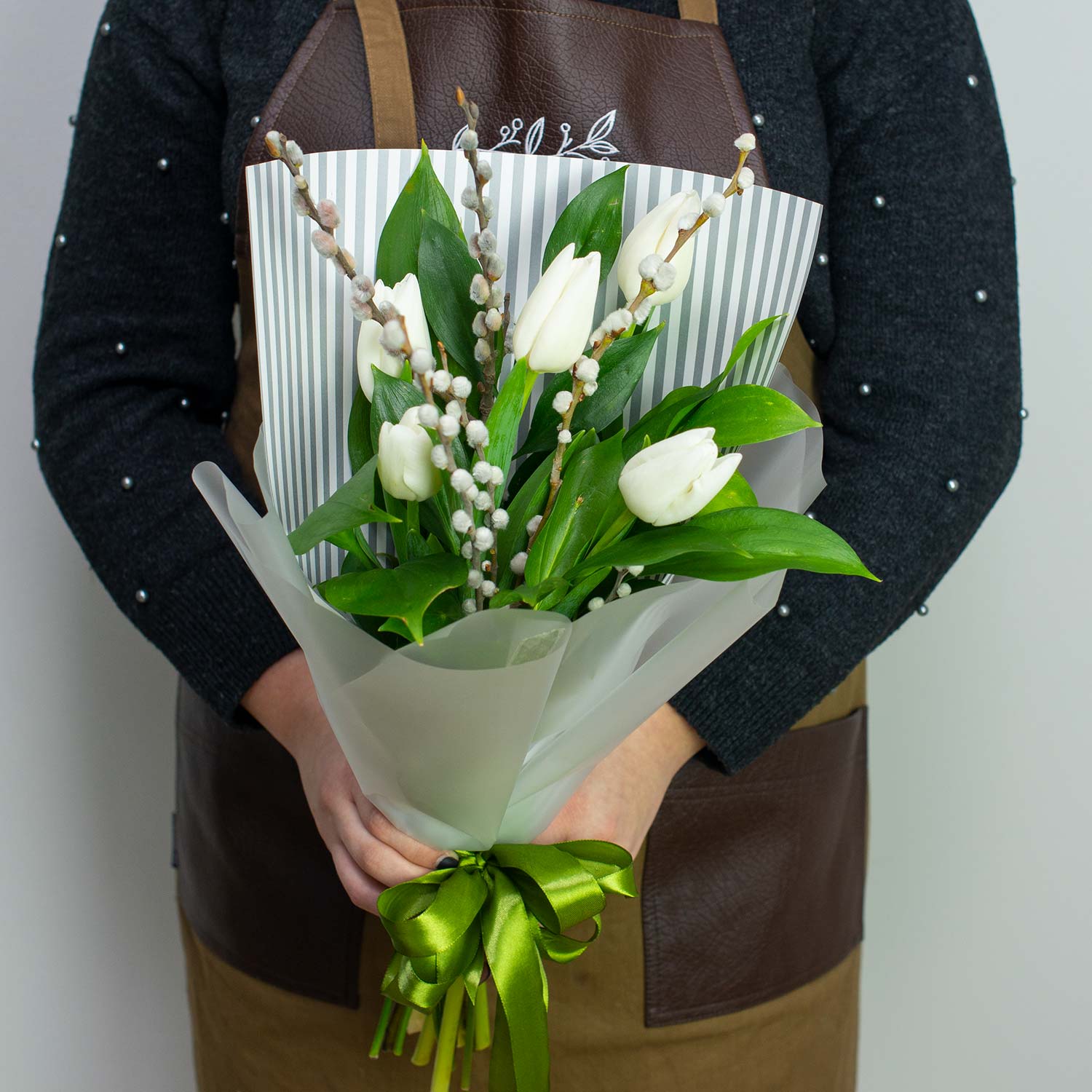 Небольшой букет из 5 белых тюльпанов, вербы и зелени. Упаковка - дизайнерская пленка.Примерный диаметр букета: 25 см