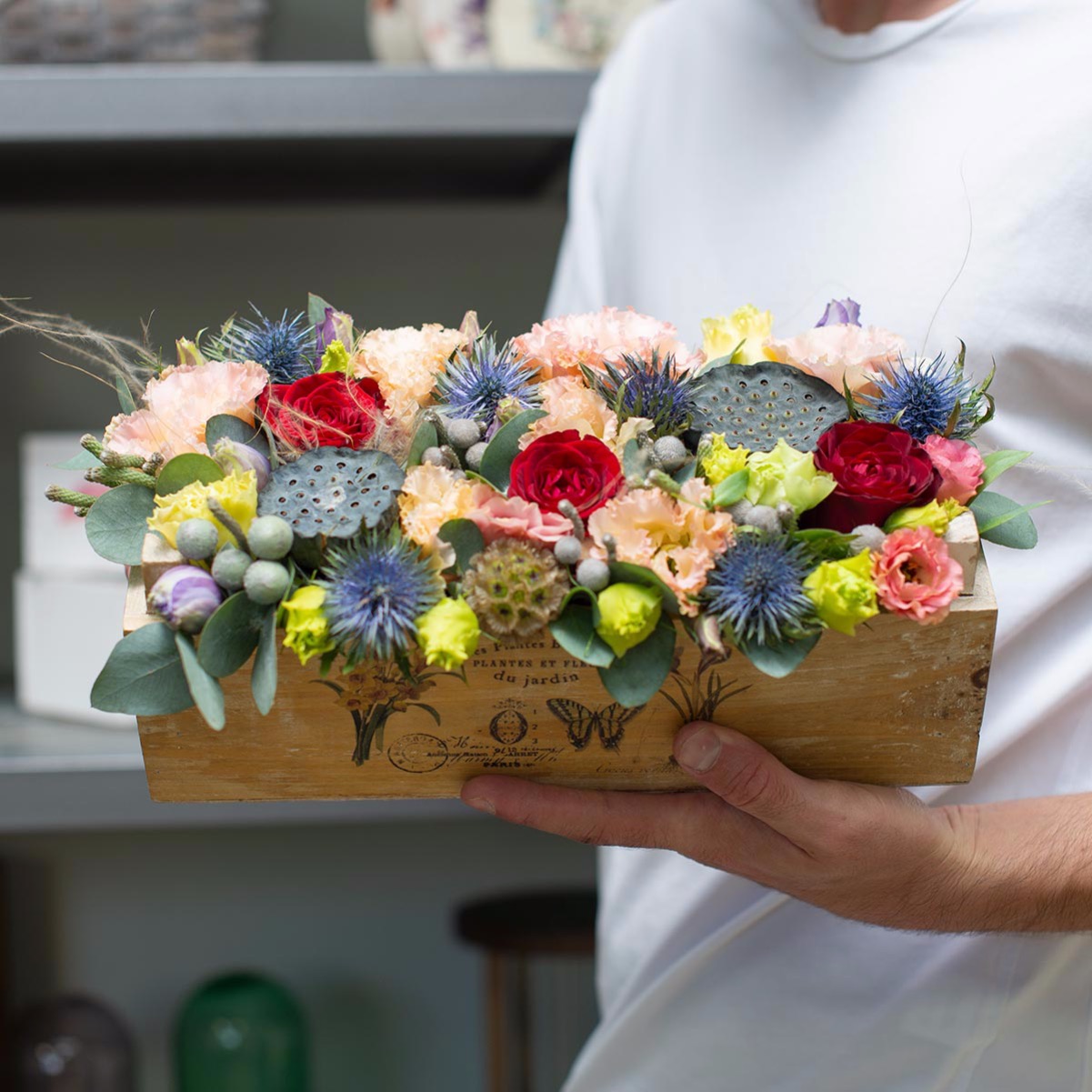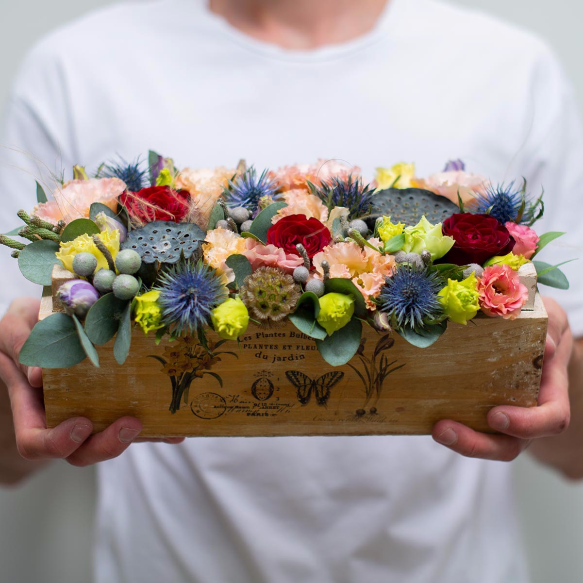 Стильный цветочный деревянный ящик с розами, эустомами, коробочками лотоса, эвкалиптом, ирингиумом, брунией и другими цветами. Создаст воздушное и легкое настроение.Ширина ящика с цветами: 30 см