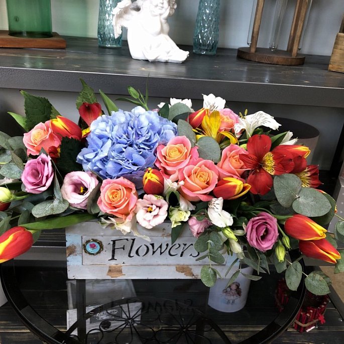 Коробочка с 10 тюльпанами, 15 фрезиями, 1 гортензией (возможна замена на другие цветы), 7 розами, эвкалиптом и зелениРазмер композиции: 25*40 см