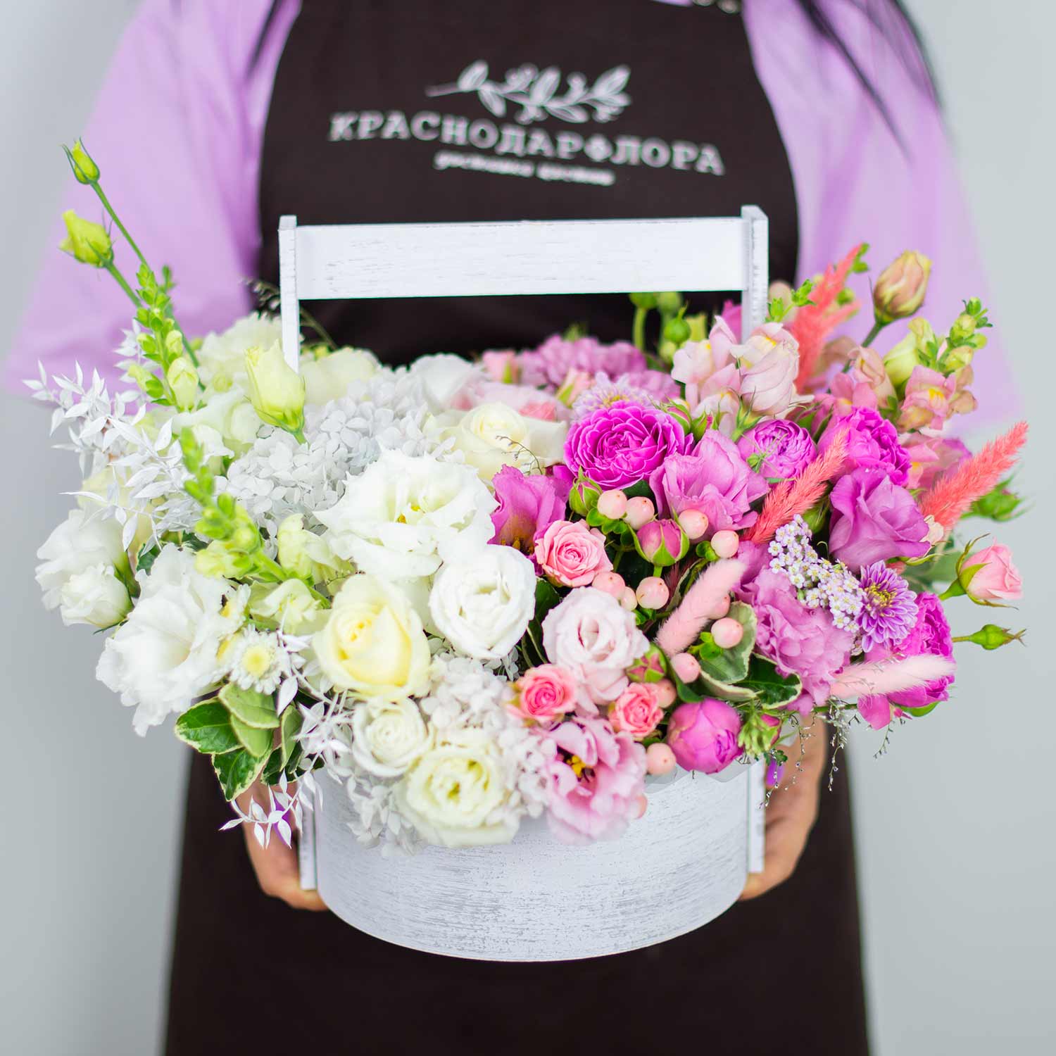 Нежная композиция в деревянном ящике с белым и красным доминирующими цветами.Состав композиции: