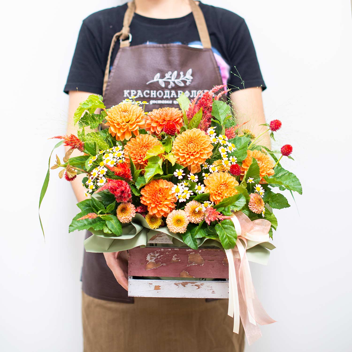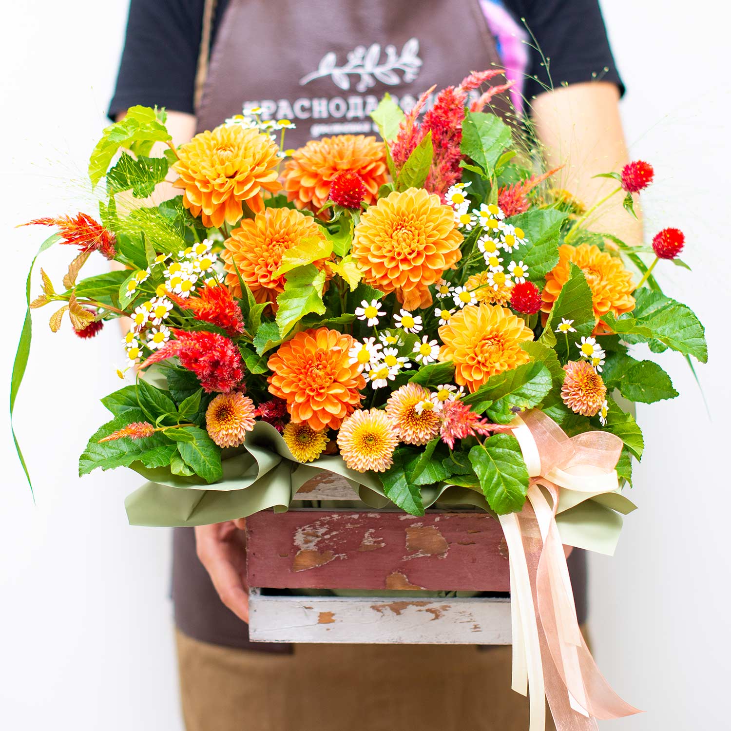 Композиция в деревянном ящике с хитом сезона - пушистыми георгинами и декоративной зеленью.Состав композиции: