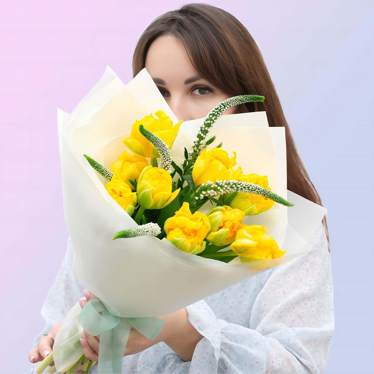 Самый жизнерадостный букет в нашей коллекции. Энергичный микс из ярко-желтых тюльпанов и белоснежной вероники. Он работает как мгновенный заряд оптимизма и света, даже если за окном пасмурно.