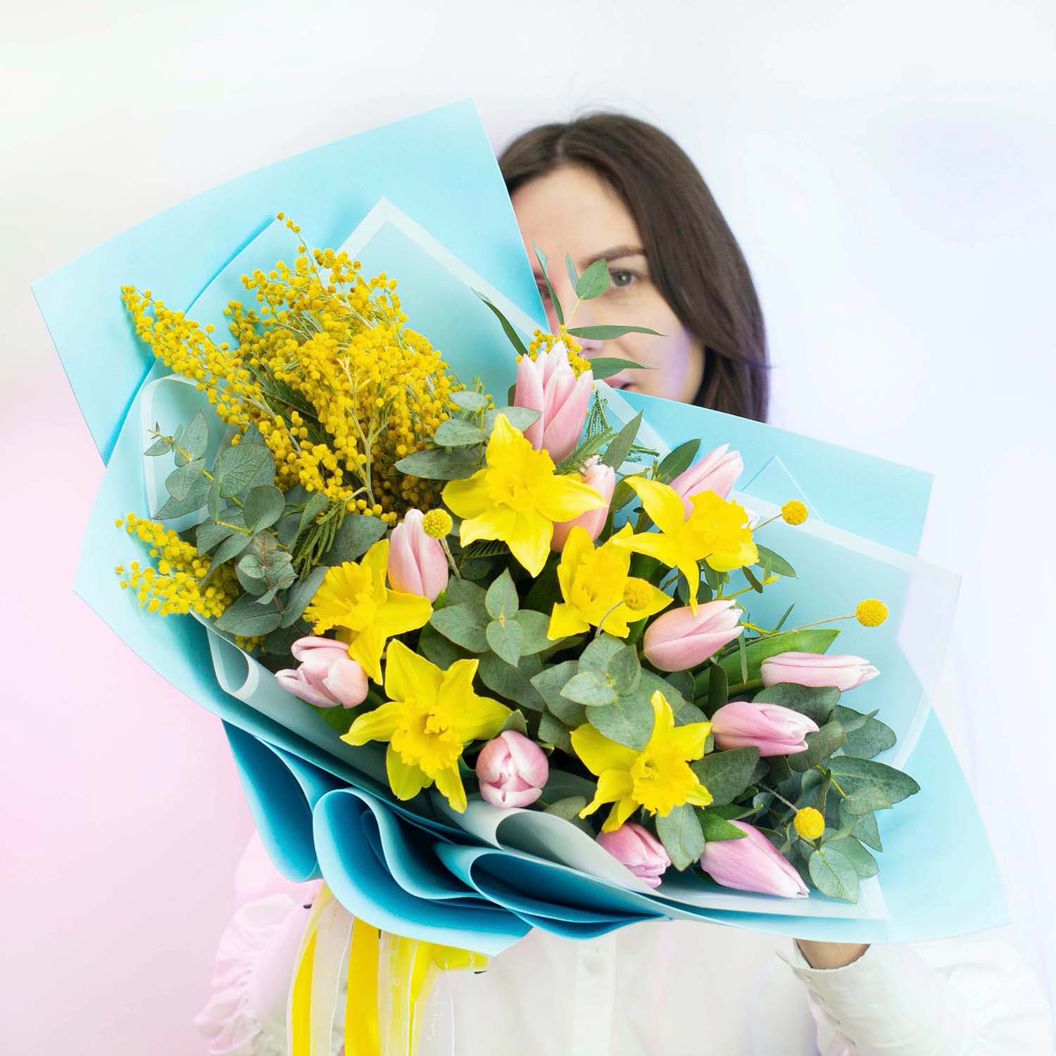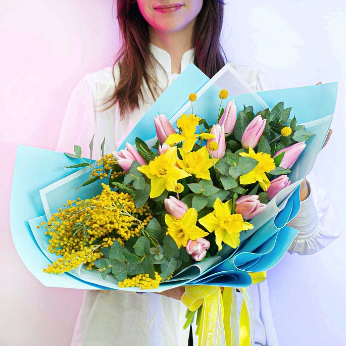 Ароматный весенний букет с мимозой, тюльпанами и нарциссами. Контрастная упаковка голубого цвета.Состав букета: