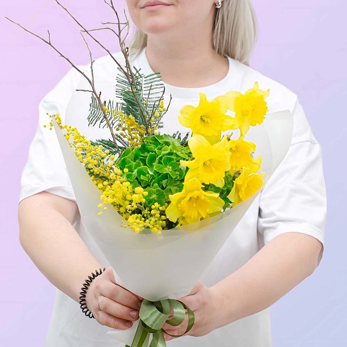 Настоящий витаминный заряд из солнечных нарциссов, пушистой мимозы и сочной гортензии. Этот букет — концентрат весенней энергии и тепла в ваших руках.