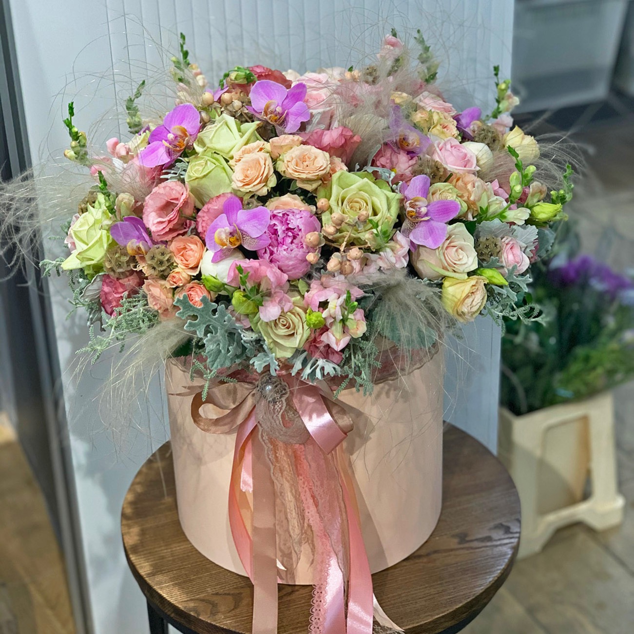 Очень большой цилиндр с 5 розовыми пионами, 10 орхидеями, 19 эустомами, 10 веток кустовой розой, 15 штук импортной крупноголовой розы, 5 штук львиный зев, цинерарией, 5 гиперикумов сезонной зеленью, декоративные элементы. Возможны замены по некоторым позициям по согласованию с заказчиком!Размер цилиндра без цветов 35*40 см