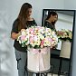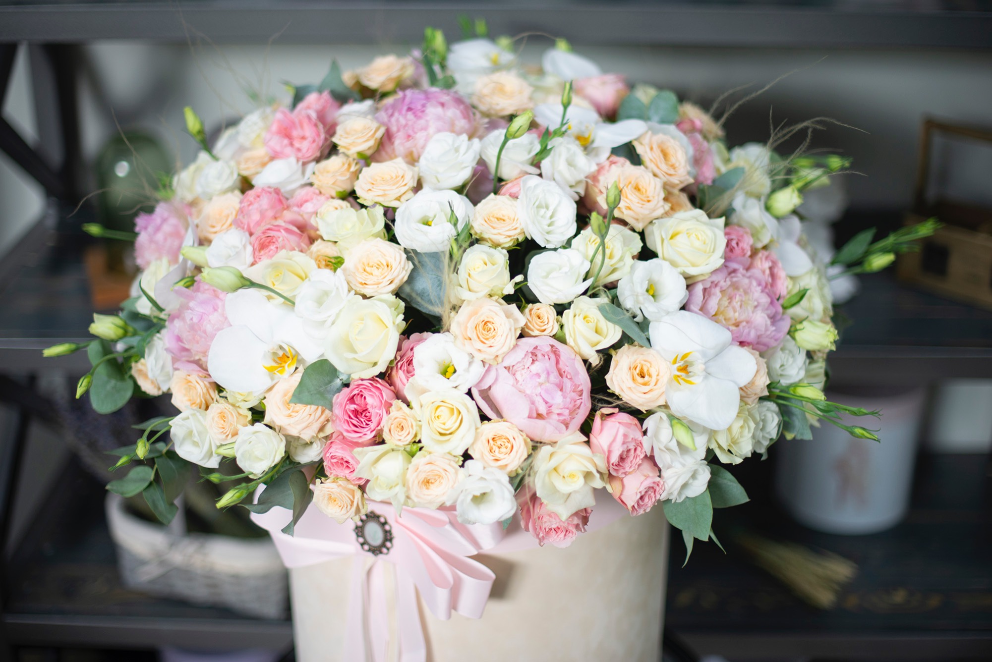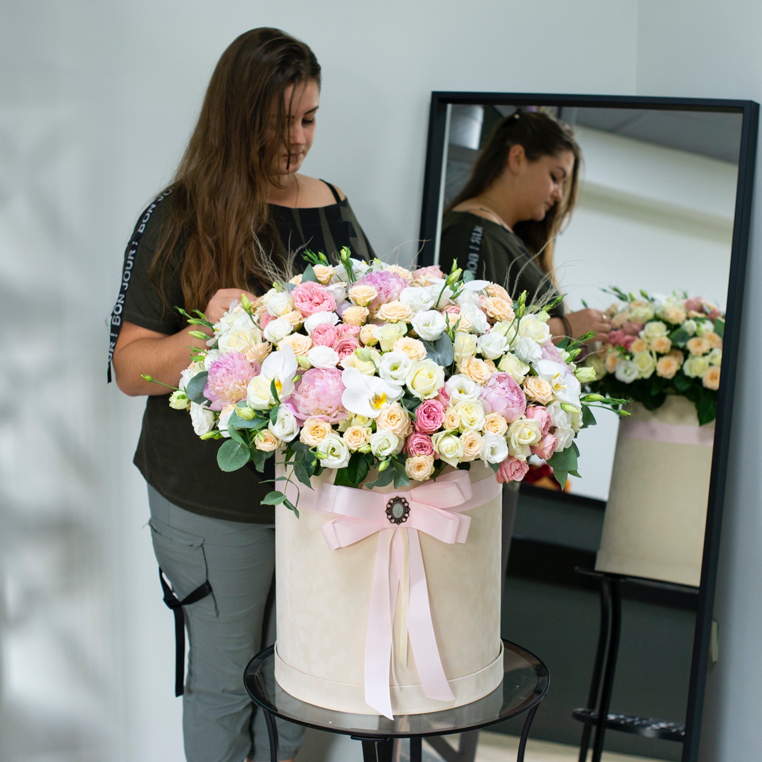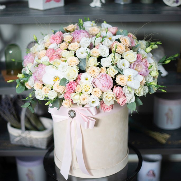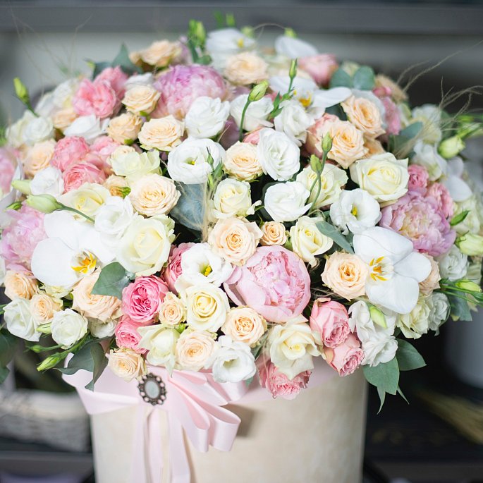 Очень большой цилиндр с 10 розовыми пионами, 10 орхидей фаленопсис, 19 эустом, 41 роза белая "Аваланж", 10 кустовых пионовидных роз бомбастик, 20 кустовых роз кремовых "Татьяна", 15 веток эвкалипта миндалевидного, 5 веток ковыль, сезонной зеленью, декоративные элементы. Возможны замены по некоторым позициям по согласованию с заказчиком!Размер цилиндра без цветов 35*40 см
