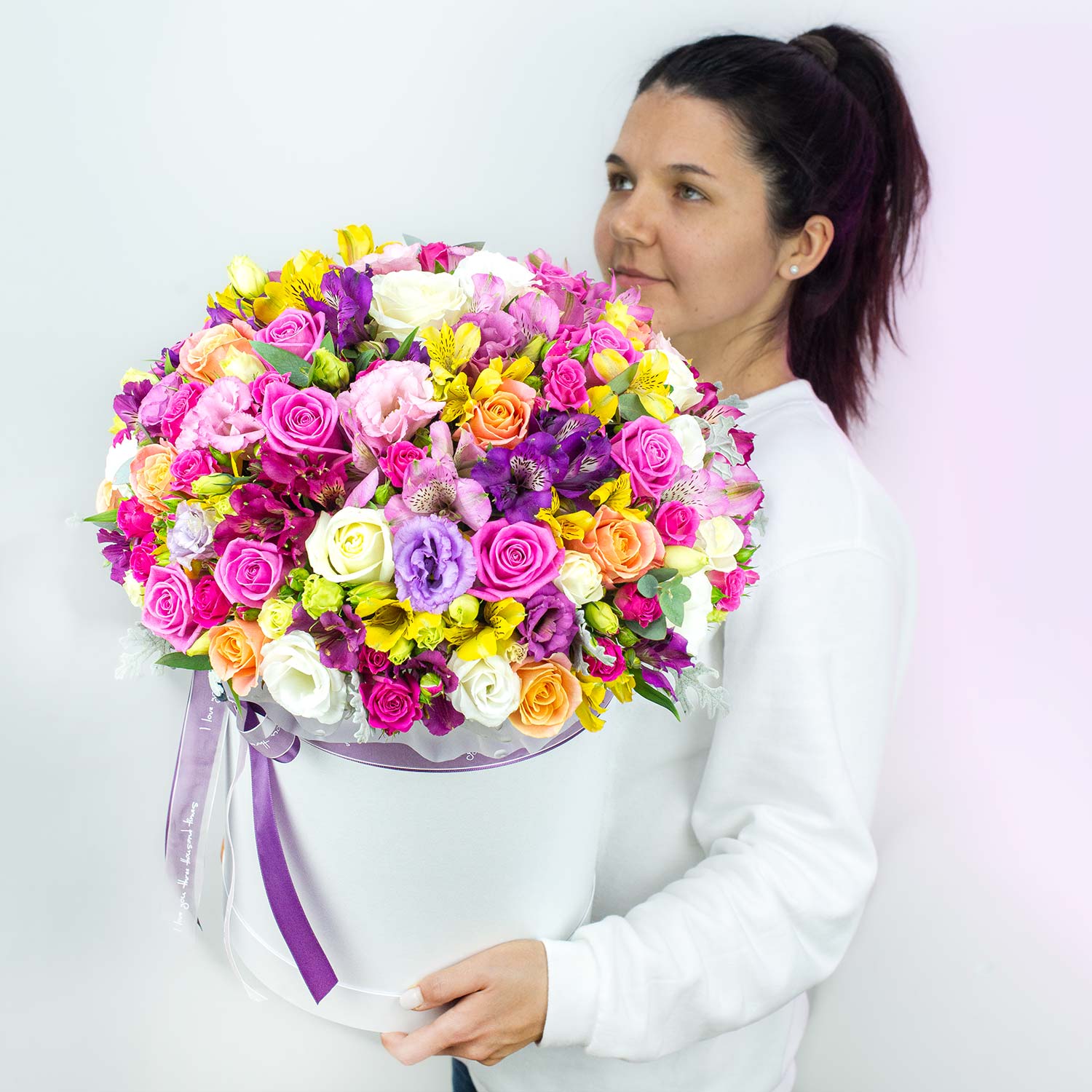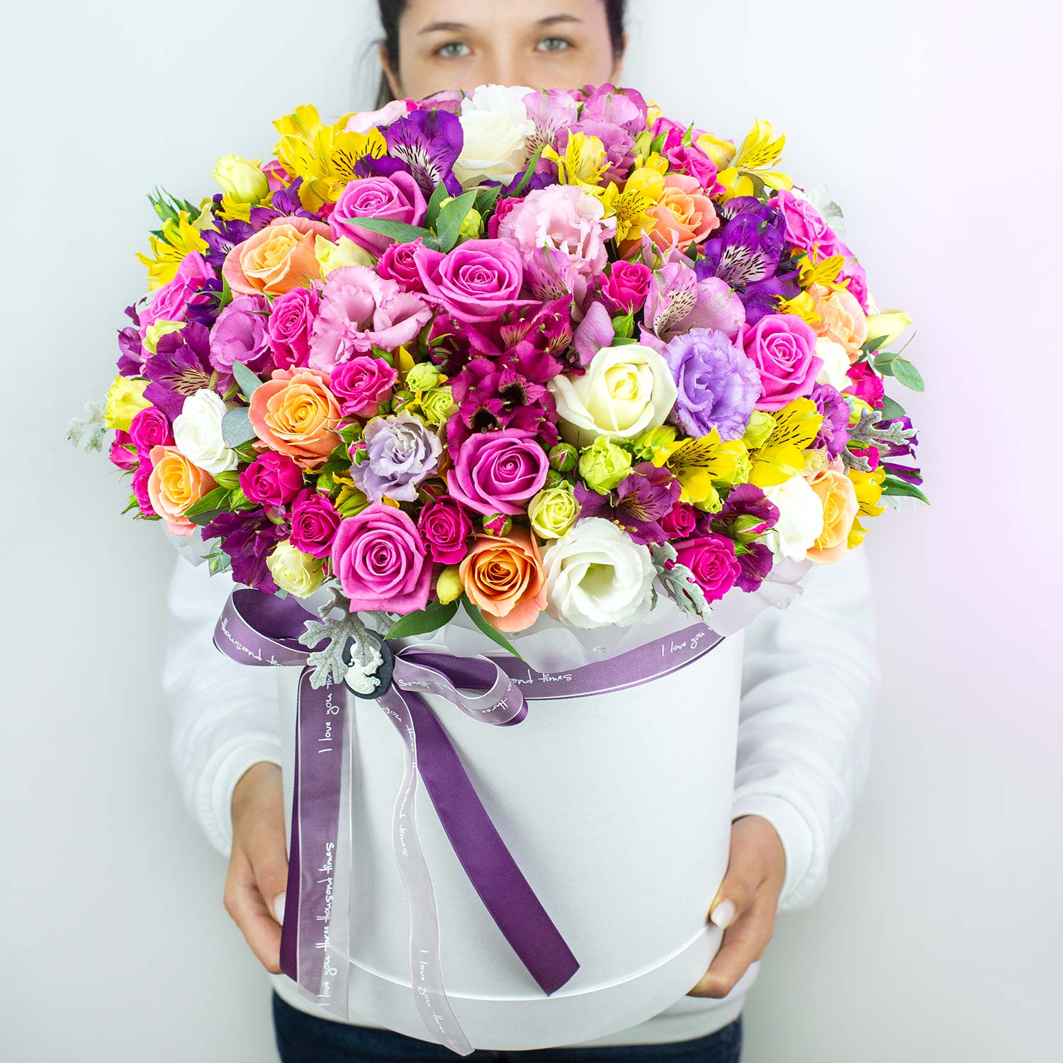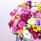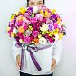 Шляпная коробка 25*30 см с миксом цветов: кустовые розы, фрезия (по наличию), эустома, роза, цинерария, эвкалипт.Состав может меняться в зависимости от сезонности.