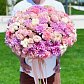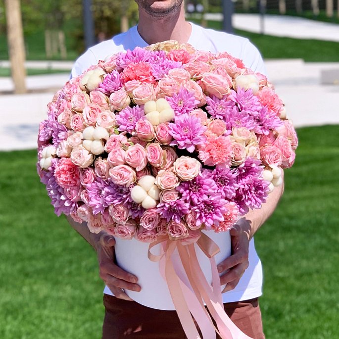 Большой цилиндр с 19 хризантемами, 19 кустовыми розами, 10 гвоздиками и 15 штук воздушного хлопка. Декоративные элементы.Размер композиции 50*50 см